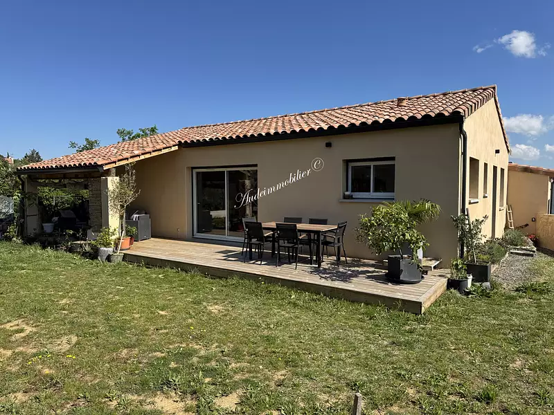 Située dans un village proche de Limoux et de ses commerces et services, maison récente de plain-pied avec jardin et garage. D'une surface habitable de 92 m2, cette maison se compose : un hall d'entrée, un couloir, un WC, un séjour / salon / cuisine aménagée de 44,82 m2, un couloir de desserte, une chambre de 9,38 m2, une chambre avec dressing de 13,8 m2, une chambre de 10m2, une salle de bain, un garage de 14,9 m2, une terrasse de 32,5 m2, un jardin de 460m2 environ.