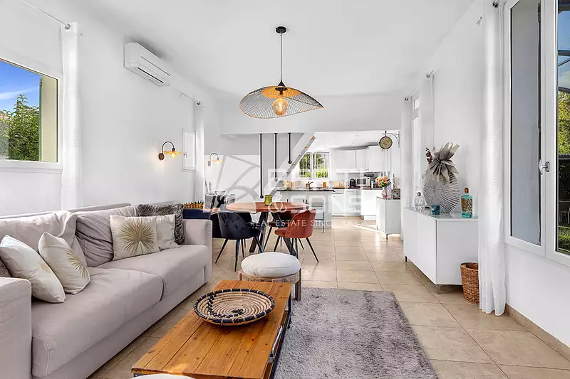 Le Groupe Berti et Sons vous présente en exclusivité cette charmante maison de plain-pied située au coeur d'un quartier très recherché de La Napoule, à seulement quelques minutes à pied des plages, du port, des commerces et de la gare SNCF. Édifiée sur un terrain plat de 475 m², cette maison de 93 m² offre un cadre de vie paisible, ensoleillé et parfaitement fonctionnel. Dès l'entrée, vous serez séduit par un double séjour baigné de lumière grâce à son exposition plein sud, donnant accès à une agréable véranda de 20m2 avec vue sur la verdure et le San Peyre. La cuisine, ouverte et entièrement équipée, prolonge l'espace de vie de manière conviviale. La maison dispose de deux grandes chambres, chacune avec leur propre salle de bains ou salle d'eau, ainsi qu'un WC invités. Une mezzanine avec coin nuit et des combles aménageables offrent des couchages supplémentaires ou du rangement selon vos besoins. Côté extérieur, vous profitez d'une belle terrasse plein sud, idéale pour les repas et les moments de détente, d'un jardin arboré à l'abri des regards, d'une pergola bioclimatique, ainsi qu'un espace de rangement indépendant d'environ 15 m². Un garage fermé complète le bien, avec la possibilité de stationner 3 à 4 véhicules supplémentaires sur le terrain. Entièrement climatisée, chauffage au sol, et système d'alarme cette maison allie charme et confort moderne dans un environnement privilégié. Portail et garage électriques. Que ce soit pour y vivre à l'année, en résidence secondaire ou pour un investissement locatif saisonnier, cette maison coche toutes les cases : emplacement idéal, agencement optimisé, extérieur soigné et aucun travaux à prévoir. Une belle opportunité à ne pas laisser passer. Contactez nous dès maintenant pour organiser une visite ! (5.26 % honoraires TTC à la charge de l'acquéreur.) Maureen Chenesseau (EI) Agent Commercial - Numéro RSAC : - .