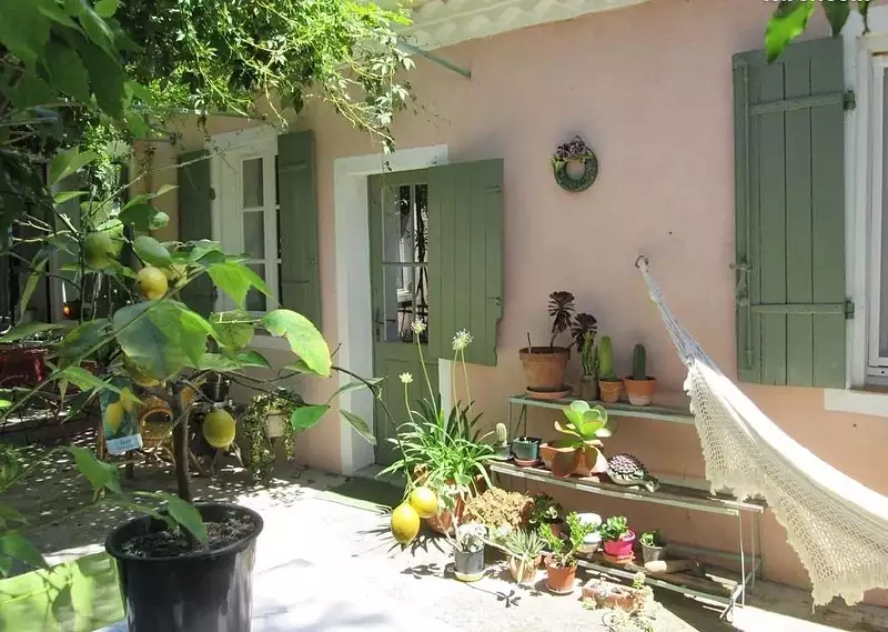 Intéressante maison 1930 dansc un jardin fleuri à l'ancienne avec terrasse et tonnelle.