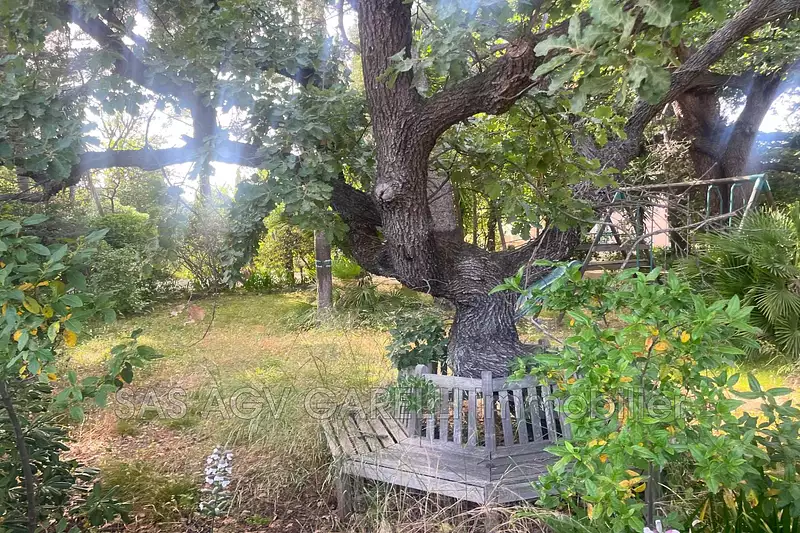 Le bas de cette maison comprend une terrasse exposé ouest de 15,12 m², s'ouvrant sur un jardin clôturé situé dans un espace boisé classé de 73,67 m². Cet espace boisé classé offre une très belle fontaine, plusieurs arbres comme des oliviers, cyprès, caroubiers, magnolias et les massifs méditerranéens...
