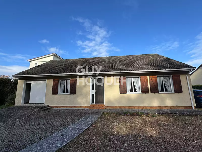 BRETEUIL - Proche commerces et écoles - Pavillon de plain-pied de 93 m² comprenant : entrée, séjour, cuisine, 3 chambres, salle d'eau et WC. Nombreux rangements. Chauffage électrique. Double vitrage. Garage attenant de 24 m² avec espace buanderie et cave. Tout à l'égout. Garage indépendant de 17m². Le tout sur un terrain clos de 945 m².