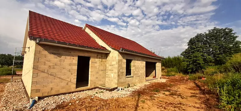 Assainissement en mini-station (déjà en place), terrain engazonné, charpente en fermette, menuiseries en PVC et Alu, tuiles en terre cuites.