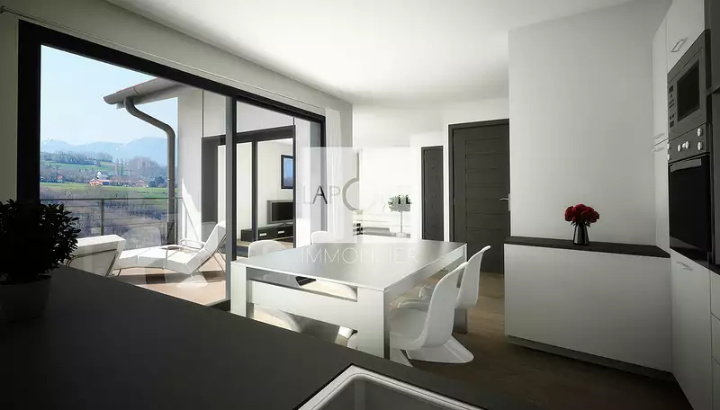 FRANGY MAISON INDIVIDUELLE de 93m2 implantée sur 510m2 de terrain avec cuisine ouverte sur salon avec un accès directe sur une terrasse de 32m2, vue superbe jusqu'à LA TOURNETTE, 4 chambres dont une avec salle de douche, 2 WC, une salle de bains. Places de parking.