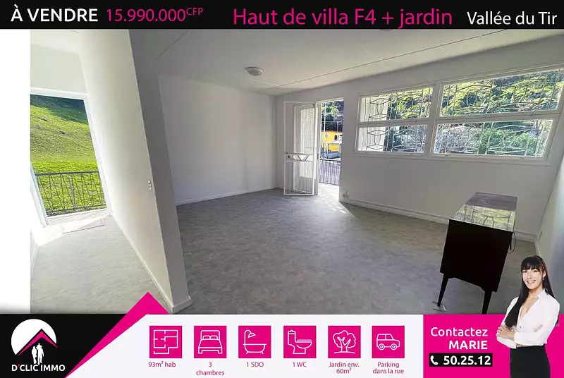Située dans une rue très calme d'un quartier résidentiel de Vallée du Tir, l'agence D'CLIC IMMO vous propose en exclusivité un spacieux haut de villa de type F4 de plain pieds de 93m² habitable + environ 100m² de jardin privatif, situé dans une petite copropriété de deux logements (haut et bas de villa), sans charges.