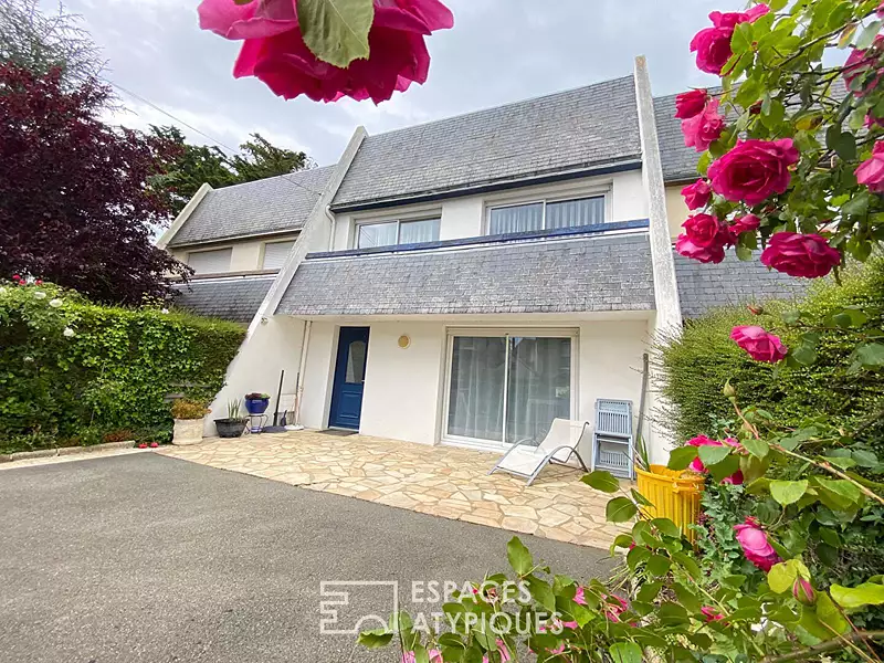 Un air de vacances : à 2 minutes à pied de la plage du Val-André, venez découvrir cette originale maison de villégiature de 93m2 édifiée en béton sous ardoises, installée dans une rue paisible de la célèbre station balnéaire. Cette maison, à l'écart de la circulation, vous surprendra tout d'abord par son architecture singulière. Un haut portail sécurisant la propriété dissimule habilement la cour bitumée close de haies végétales. Cette cour laisse place à 2 stationnements de véhicules. La terrasse orientée Sud, dallée et ombragée partiellement grâce à une avancée de toit, offre un cadre agréable pour se détendre mi-ombre, mi-soleil. Le hall d'entrée, comportant un placard technique et un placard de rangement avec portes miroir, constitue le point de distribution entre le RDC et l'étage. Au RDC, disposant d'une lumière traversante, le salon séjour lumineux vous accueille. Le regard court ensuite jusqu'à la cuisine ouverte en enfilade. Cette cuisine aménagée, donne directement sur une autre terrasse située à l'arrière de la propriété. Cette terrasse ensoleillée en matinée, permet d'accéder par un petit portillon à un environnement naturel ludique avec étang (roseaux, poules d'eau et libellules). Le stationnement de véhicules est possible dans la rue de ce côté également. Peu de passage hormis les résidents. Une vie est possible de plain pied, grâce à une chambre et sa salle d'eau attenante, avec WC séparé. L'esprit "vacances en bord de mer" parfume cette maisonnée atypique, capable d'accueillir une grande famille ou des amis, puisqu'à l'étage, ce sont 3 chambres équipées actuellement de lits doubles, un espace de rangement, et une salle d'eau avec wc qui complètent cet ensemble. Deux box de rangement sécurisés sur la terrasse côté étang permettent de stocker à l'abri le petit équipement d'été comme les chaises de jardin, le barbecue, ou des vélos qui vous conduiront sur la place du marché à 3 minutes de là. Contactez moi pour une visite ou de plus amples renseignements. CLASSE ENERGIE : D / CLASSE CLIMAT : B Montant moyen estimé des dépenses annuelles d'énergie pour un usage standard établi à partir des prix de l'énergie de l'année 2024 : entre 1440 euros et 1990 euros Les informations sur les risques auxquels ce bien est exposé sont disponibles sur le site Géorisques : www.georisques.gouv.fr Ne tardez pas à venir la découvrir. Magalie GORIN : 06.22.97.14.01 RSAC : 888 784 329- Saint-Brieuc
