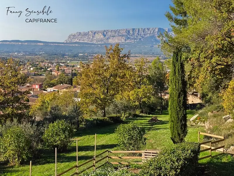 Cette maison d'environ 93 m² s'ouvre sur un terrain d'environ 4 100 m², organisé en larges paliers naturels, et offre une vue époustouflante sur la Sainte-Victoire, que l'on pourra contempler au fil des saisons, dans les lumières si chères à Cézanne.