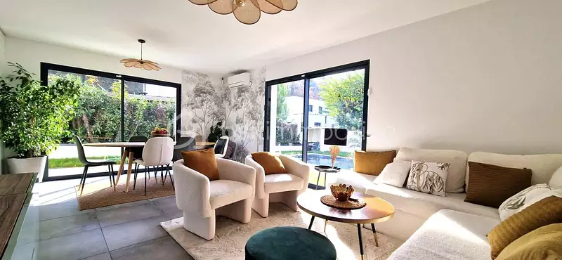 L'ensemble donnant sur le terrain arboré de 395m² et sa jolie piscine exposée sud-ouest.