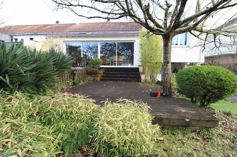 LES COUETS limite Rezé, maison année 70, pièce de vie avec cheminée, cuisine ouverte d'angle entre sejour et salle à manger, grande baie vitrée donnant sur terrasse, 2 chambres possible 3 chambres, salle d'eau,grand sous sol (garage,cave,atelier), jardin clos boisé avec dépendance. pompe à chaleur et isolation récente, prox. bus. Proposition d'aménagement virtuel non contractuelle en dernière photo.