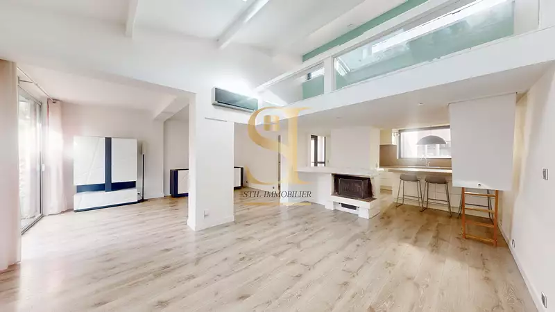 La grande cuisine lumineuse, ouverte sur un double séjour traversant, offre un espace de vie convivial, baigné de lumière naturelle, avec un accès direct à la terrasse et au jardin privatif, parfaits pour les repas en plein air ou les moments de détente en famille.