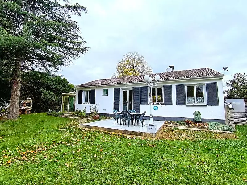 Dans un environnement champêtre proche forêt et étangs, je vous propose ce pavillon de plain pied comprenant une entrée avec placard intégré desservant une cuisine ouverte équipée (de qualité) sur séjour, salon avec cheminée insert, un dégagement, wc et salle d'eau (douche italienne), deux chambres avec placard intégré, une troisième chambre avec sa salle d'eau. Une véranda. Un garage attenant avec coin cellier/buanderie et une cave. Un appentis bois. Deux chalets abris de jardin. L'ensemble est soigné avec une décoration contemporaine. Grand terrain arboré avec un petit plan d'eau. Les commerces et services sont situés à 5 km environ. Cadre calme et reposant.