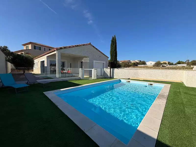 Située dans un environnement agréable, découvrez cette maison moderne de plain-pied d'une superficie de près de 94 m², édifiée sur un terrain de 566 m² avec piscine.