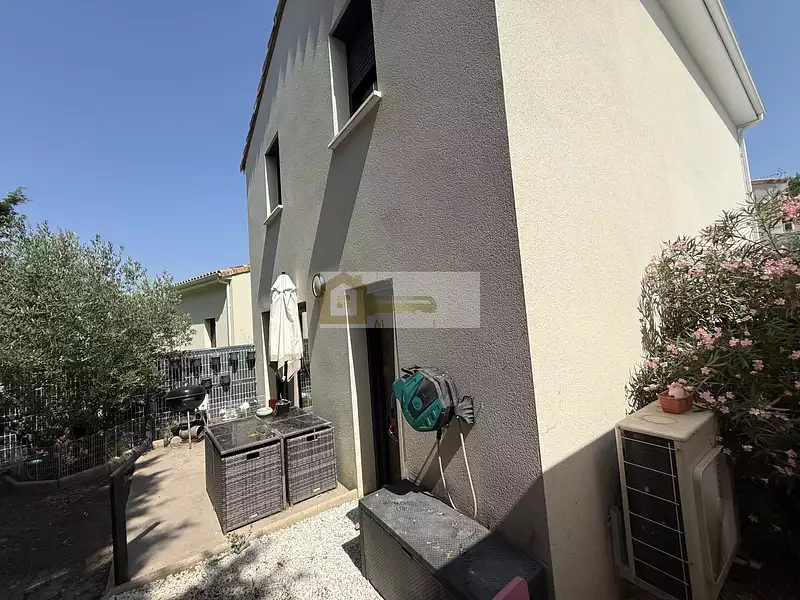 villa récente contemporaine de type T.4 mitoyenneté de 94m² environ de type T.4, elle se compose en rez-de-chaussée d'un hall d'entré, d'un cellier et d'une salle de douche avec un WC ainsi qu'une une cuisine ouverte donnant sur la pièce de vie avec un accès à la terrasse. À l'étage on y découvre 3 chambres, une salle de bain et un WC indépendant. De plus, elle possède une place privée et un garage.