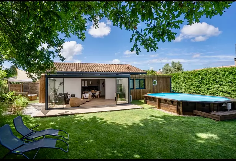 Coup de coeur assuré pour cette Jolie maison récente ossature bois au fond d'une impasse très au calme et sans vis à vis proche de toutes les commodités. Elle se compose d'une entrée, d'une belle pièce de vie/double séjour avec véranda chauffée et climatisée pouvant être ouverte en totalité aux beaux jours et devenir une belle terrasse couverte, une cuisine entièrement équipée, une salle d'eau, wc séparé et trois belles chambres ainsi qu'une mezzanine pouvant service de bureau ou chambre supplémentaire. Un beau terrain arboré sans vis à vis et au calme disposant d'un jacuzzi et d'une piscine en bois semi enterrée. Pompe à chaleur reversible et panneaux photovoltaîques neufs. Un brai havre de paix à visiter sans tarder. (3.00 % honoraires TTC à la charge de l'acquéreur.)