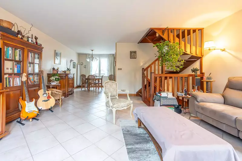 Au rez-de-chaussée haut, un beau séjour d'environ 35 m² avec accès à terrasse et jardin, une cuisine séparée équipée.