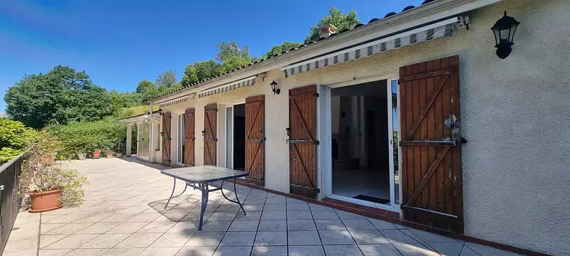 Implantée sur un terrain paysagé, clos et arboré, cette propriété bien entretenue développe environ 95m2 de surface habitable, comprenant: -un grand salon lumineux avec cheminée, ouvrant sur une superbe terrasse exposée plein sud, idéale pour profiter du soleil et du panorama. - une cuisine indépendante entièrement équipée. -3 chambres confortables. -une salle de bain moderne et WC séparé. -un espace buanderie.