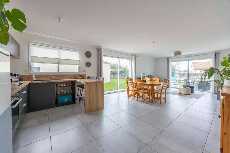 Pièce de vie lumineuse de 44 m² exposée sud-ouest avec une cuisine aménagée et équipée d'un four, d'une plaque à induction et d'une hotte