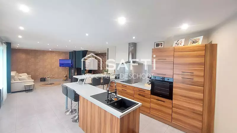 Elle se compose au rez de chaussée, d'un séjour-salon avec poêle à bois, une cuisine, une salle d'eau, un espace buanderie, une chambre et un wc.