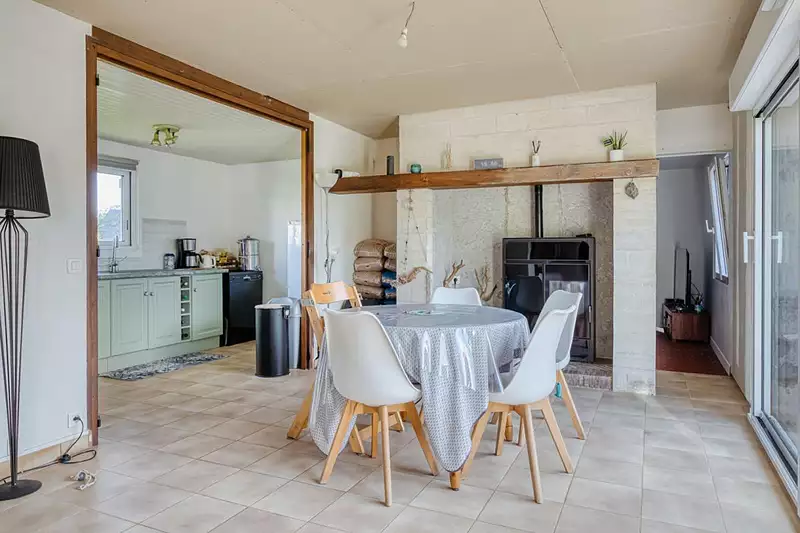 Beau séjour sur cuisine ouverte, le tout développant 36 m2, salon (ou chambre) avec cheminée, WC indépendant, salle de bain et buanderie forment le rez-de-chaussée.