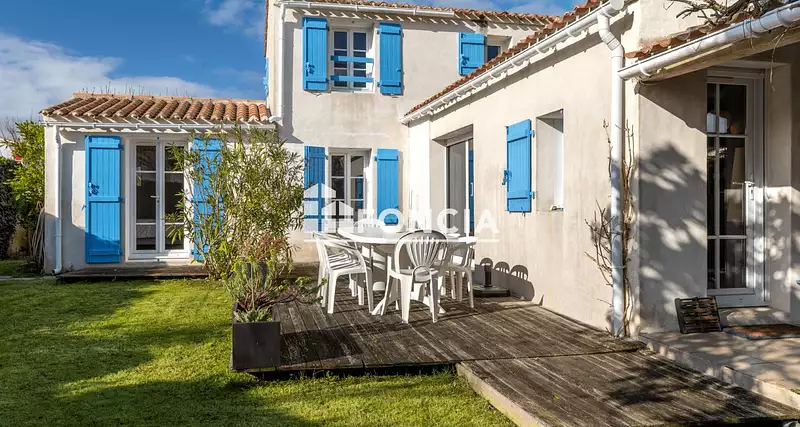 Cette charmante maison spacieuse et lumineuse offre un cadre de vie agréable, à proximité immédiate des plages et des commerces comprenant : Entrée, grande salle à manger-salon avec coin cuisine ouvert, deux chambres avec placard, salle de bains (baignoire, bidet, meuble vasque), wc avec lave-mains. Etage : deux chambres avec placard, salle d'eau (douche, meuble vasque, wc). Préau, garage à vélos. Belle terrasse, jardin arboré. Place de parking privative. Situation calme et reposante.