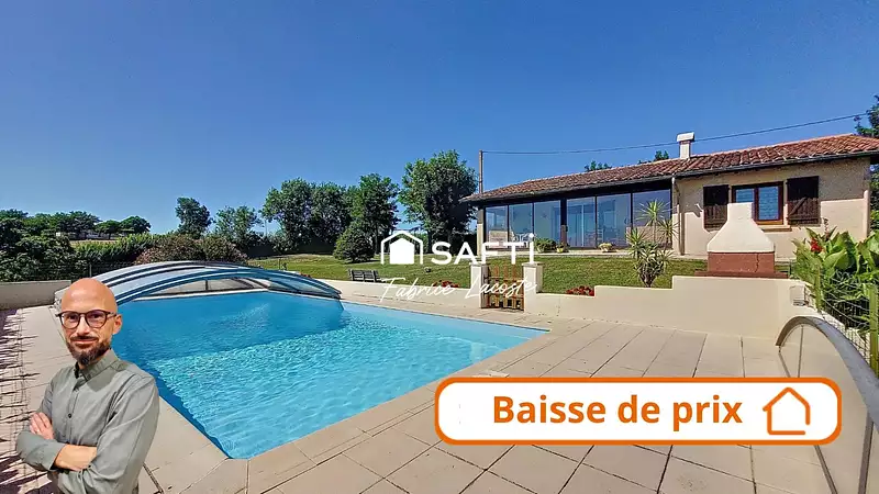 Dans ce cadre privilégié, cette maison de plain-pied d’environ 95 m² habitables, construite en 1978, s’implante au sommet d’une colline. Exposée plein sud, elle offre une vue panoramique à 180° sur les vallons et les Pyrénées en toile de fond. Depuis la véranda, on profite d’un superbe jardin arboré et soigné, d’une piscine 10 x 5 sans vis-à-vis, avec margelles, clôture et dôme.
