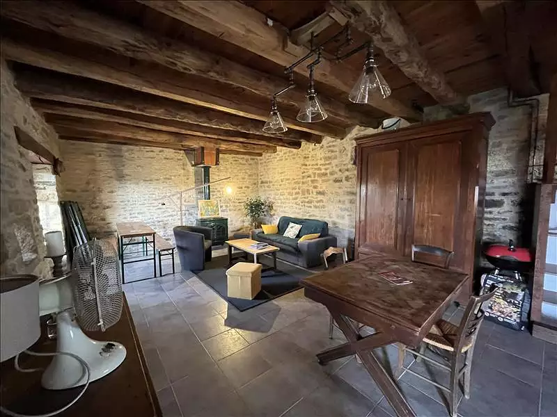 Charmente maison en pierre au bord d'un hameau, contenant 2 belles chambres, une salle de bain avec WC, Pièce de vie avec cuisine ouverte et son poêle à bois, cellier et WC. A l'exterieur une terrasse couverte et petit jardin avec une jolie vue. Logement à consommation énergétique excessive : classe F