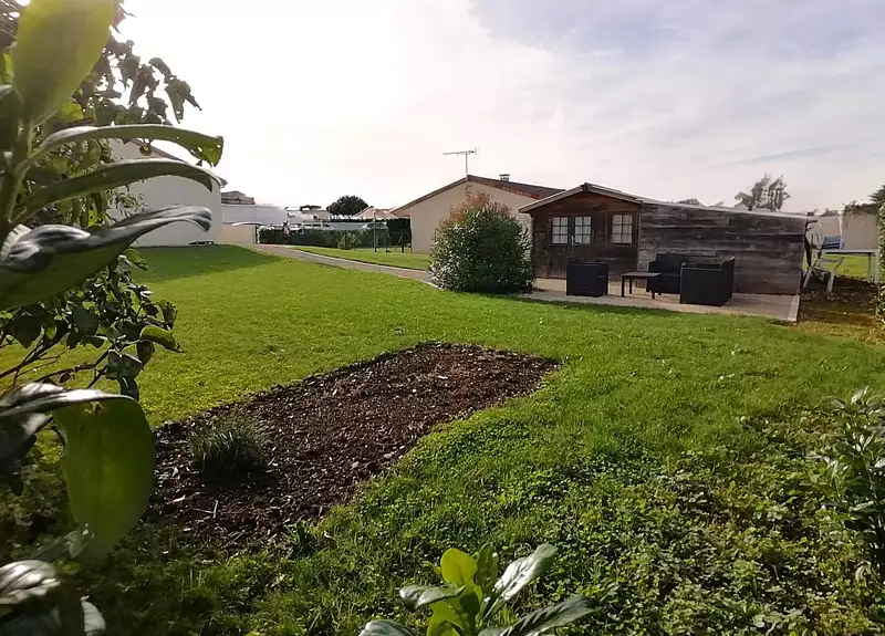 Terrain clos et arboré réalisé par un paysagiste avec pour compléter ce cocon famillial, un grand chalet de jardin..........!