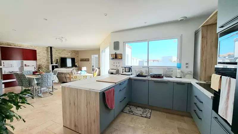 -La cuisine ouverte, entièrement aménagée et équipée, invite à la convivialité.