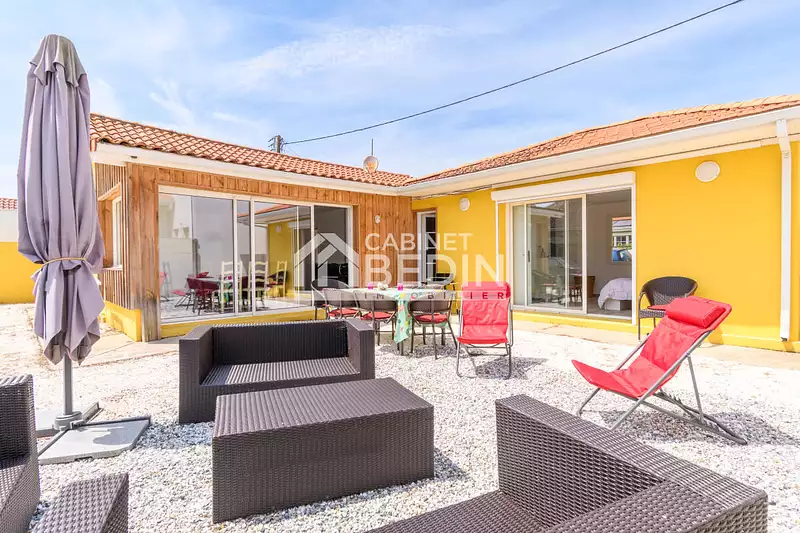 Elle se compose d’un grand séjour lumineux ouvert sur l’extérieur, d’une cuisine équipée moderne, de trois belles chambres avec rangements intégrés, d’une salle d’eau avec douche à l’italienne et d’un espace buanderie. Le tout est complété par une cour gravillonnée, sans vis-à-vis, comprenant un espace repas, un coin salon de jardin. L’environnement est paisible, tout en étant à proximité immédiate de la plage, des pistes cyclables, des commerces et du centre de la station balnéaire. Possibilité de stationner plusieurs véhicules dans la cour.