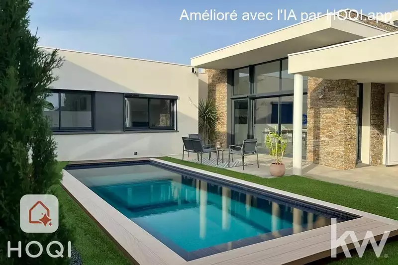Cuisine aménagée-équipée, cellier, une chambre parentale avec dressing aménagé, deux chambres avec placards, une salle d'eau (douche à l'italienne), wc avec lave mains, patio paysagé au sein même de la villa.