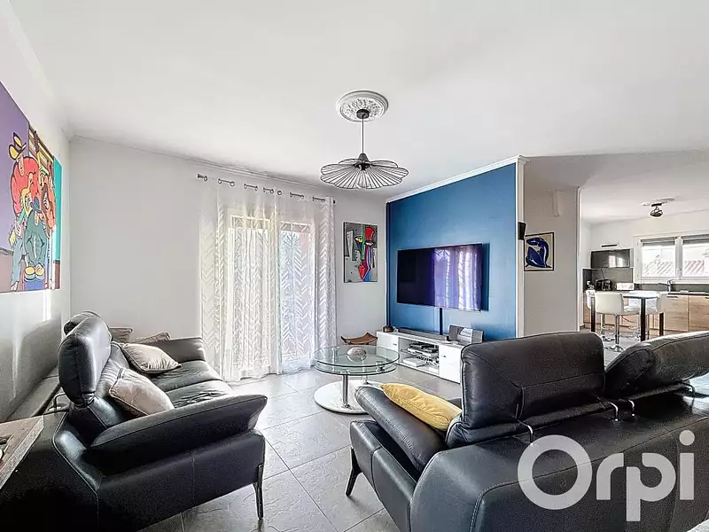 Après quelques marches, découvrez un bel espace de vie de 46 m² comprenant une entrée, un salon, une salle à manger et une cuisine ouverte contemporaine, idéale pour recevoir famille et amis.