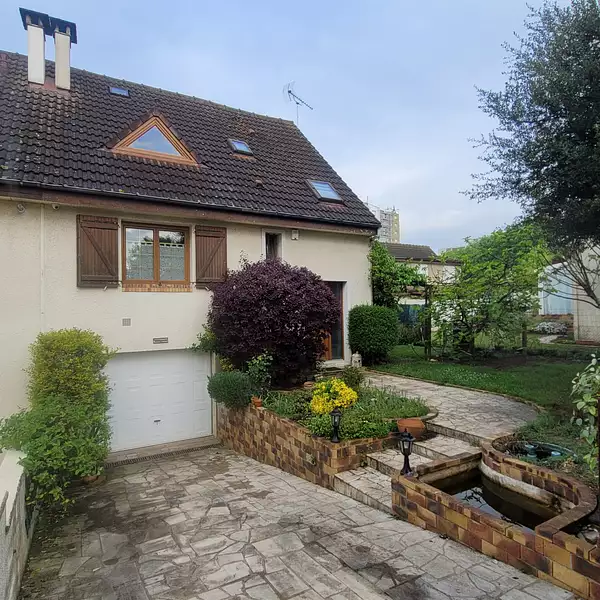 VIRY CHATILLON PAVILLON 5 pièces sur sous-sol total avec garage, buanderie, bureau à proximité des commerces et du Tram T12 comprenant au RDC : entrée, cuisine équipée ouverte sur séjour avec terrasse, salle d’eau avec wc, 1 chambre avec placard, à l’étage : 3 chambres, 1 salle de bains avec balnéo, 1 salle d’eau et wc. Chauffage par pompe à chaleur avec climatisation réversible, fenêtre PVC, en bon état.