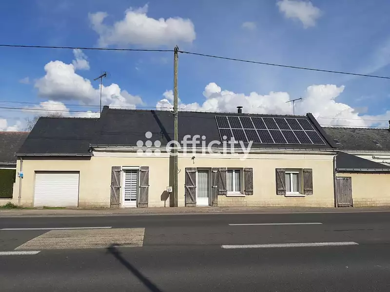49680 - VIVY - VILLAGE PROCHE de SAUMUR- Jolie maison en pierre de tuffeau style " longère/fermette " restaurée de 5 pièces pour une surface totale de 96 m²,de plein- pied avec garage et dépendances + jardin. La Maison, construite en pierre avec toit en ardoise est équipée de panneaux solaires, Les sols sont en carrelage, offrant un cachet authentique. Le terrain de 560 m² comprend un puit pouvant servir pour l'arrosage, un jardin clôturé de 200 m², idéal pour profiter de la nature environnante.