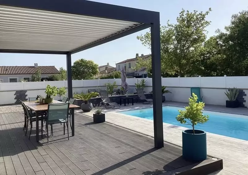 Un accès direct à une agréable terrasse avec pergola bioclimatique et coin barbecue, parfaite pour recevoir famille et amis.