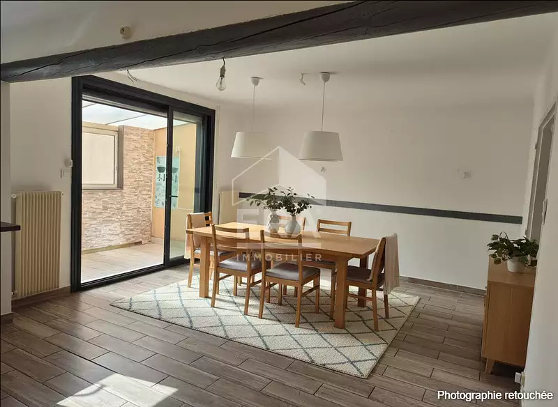 À l'extérieur, vous profiterez d'une cour ombragée par un toit végétal, idéale pour des moments conviviaux. Un grand garage complète le bien, un véritable atout rare en centre-ville.