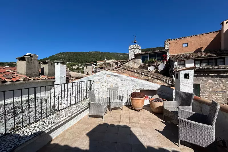 SOUS COMPROMIS DE VENTE Charmante maison de village en parfait état avec cour intérieure et terrasse. Vaste entrée, chambre 1 avec salle de douche. 1er étage: salon avec cheminée, chambre 2 avec salle de bain 2ème étage: Grande cuisine ouvrant sur cour intérieur Terrasse sur le toit.