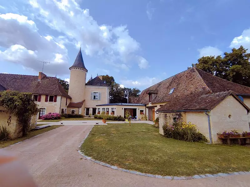 Le logis principal flanqué de ses deux tours en poivrière , en retour d'équerre une aile de dépendance ( anciens communs ) totalement réaménagée en logement de gardien avec à la suite grange-garage, cour intérieure avec atelier d'artiste, garage à vélos, dépendance du jardinier, atelier, reserve à bois, préau couvert, serre, et autre préau pour materiel de jardin.