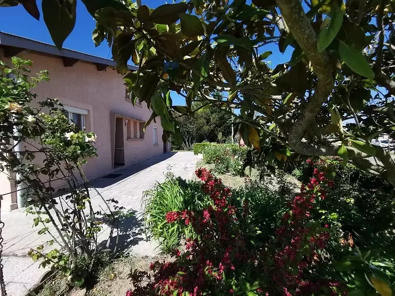 Un jardin agrémenté de jolis végétaux (rosiers, hortensias, camélias, lauriers, ...).