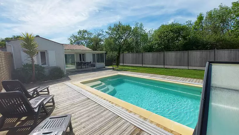 LE CHATEAU D'OLERON - Dans un environnement boisé, sur une parcelle entièrement cloturée, maison de plain pied en bon état comprenant une entrée desservant un séjour avec cuisine équipée, deux chambres ainsi qu'une salle de bains. Attenant, une troisième chambre avec accès indépendant ainsi qu'une véranda d'environ 17m2. Piscine de 3.5 x 7.5 avec local technique. Abri à vélos, auvent et carport. Cadre très agréable pour de jolis moments en famille !