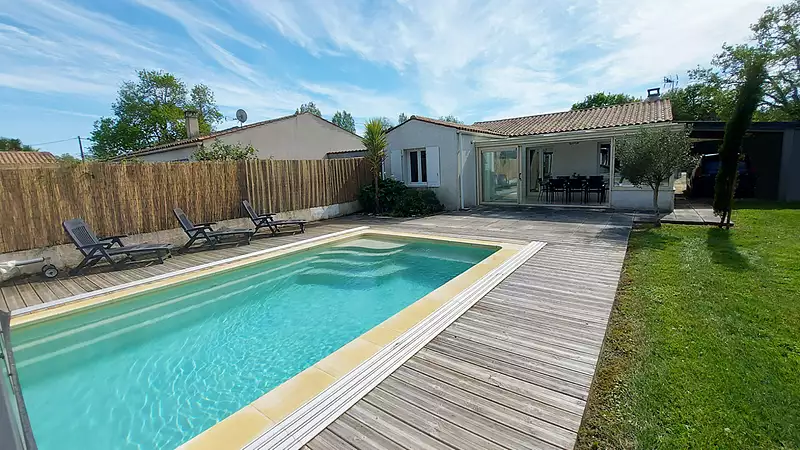 A environ 2,5 km des commerces et de la plage, sur un terrain de 533 m², une maison de 98,4 m² habitables comprenant une entrée avec placard, une pièce à vivre de 33 m² avec cuisine équipée donnant sur véranda de 20 m², une chambre avec douche et lavabo et un cellier. Un dégagement avec une salle de bains, un WC et deux chambres avec placard- Une grande terrasse avec piscine chauffée et abris télescopique - Un local piscine - Un préau - Un garage à vélo - Chauffage électrique et insert à bois (4.81 % honoraires TTC à la charge de l'acquéreur.)
