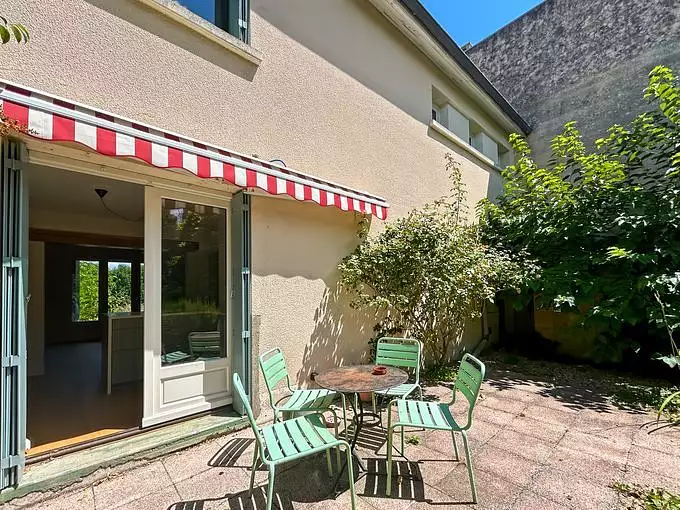 Depuis la cuisine, vous accédez directement à un jardin arboré d'environ 120m² avec terrasse et store banne. Le rez-de-chaussée comprend également des toilettes avec lave-mains ainsi qu'un accès direct au garage.