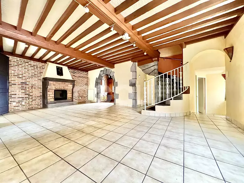 -Au rez de chaussée : cuisine ouverte sur belle pièce de vie avec cheminée, poutres et escalier en pierre de Volvic, une chambre avec wc, une salle d’eau