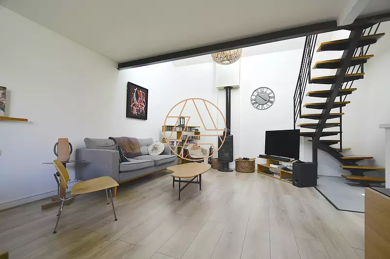 Belle Hauteur sous plafond et puits de lumière avec velux , climatisation réversible, insert à poêle. Volets électriques solaires.