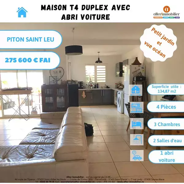 AlterImmobilier vous propose en exclusivité : A Piton Saint Leu une agréable maison T4 de 99,52 m2 habitables avec varangue de 9,33 m2 et petite terrasse à l'étage sur parcelle d'environ 184 m2.