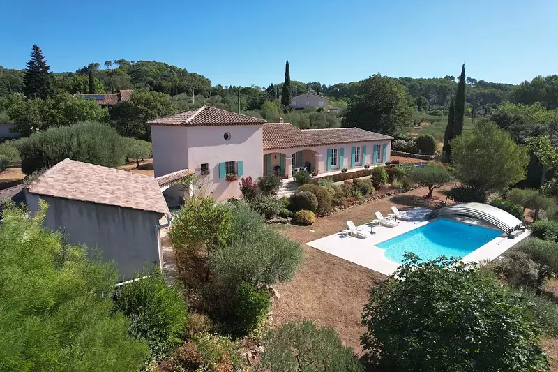 MAISON - COTIGNAC, entre les Gorges du Verdon et la Côte-d'Azur, au pied d'une impressionnante falaise de tuf, vous aurez le privilège de devenir propriétaire d’une jolie maison provençale aux portes d’un village de caractère unique aux façades colorées certifié Plus Beau Village de France depuis 2022. A proximité du village et de l’ensemble des commodités, la maison est implantée au cœur d’un terrain de 4 200 m² planté de 80 oliviers et de nombreuses essences méditerranéennes. Sans vis à vis, au calme, elle offre une vue panoramique exceptionnelle et unique sur l’ensemble de la campagne environnante. Le jardin est agrémenté d’une jolie piscine. Entrée avec dégagement, wc, agréable salon / salle à manger avec une cheminée. Cette pièce lumineuse s’ouvre sur une terrasse ombragée au Sud. Spacieuse cuisine entièrement équipée avec espace repas, cellier / buanderie, 1 chambre parentale avec salle de bains privative et wc, 3 autres chambres, dressing, salle d’eau, wc. Possibilité d’aménager l’étage (37,8 m²). Grand garage, abri voiture. Située dans un quartier résidentiel recherché, la maison est lumineuse et agréable à vivre. En excellent état général, les dimensions sont généreuses et les volumes harmonieux. Coup de cœur assuré, en résidence principale ou secondaire, pour cette maison pleine de charme. Excellent rapport locatif saisonnier possible. Les informations sur les risques auxquels ce bien est exposé sont disponibles sur le site Géorisques : georisques.gouv.fr