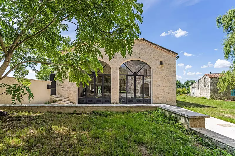 Super, stylish barn conversion, with the most fabulous stone archways restored by its current owner regardless of cost. Dating from 1866 and retaining a wealth of period features with fabulous, exposed beams and stonework with modern comforts of double glazing and pompe à chaleur cold and hot heating, giving a C energy rating. Comprising of large open plan living space with cathedral ceilings, en-suite bedrooms with balconies overlooking the garden, modern fitted kitchen with integral appliances all presented in immaculate condition with a great eye for detail from the pale ash staircase to the travertine flooring.