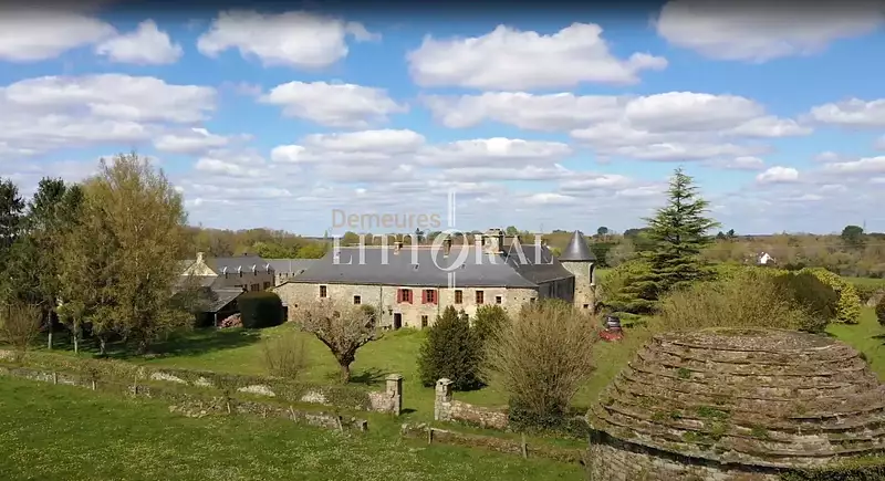 La propriété dispose de 5 chambres, de 3 hectares de prairie, d'un étang et d'un bassin. L'ensemble offrant 550 m² habitables environ.