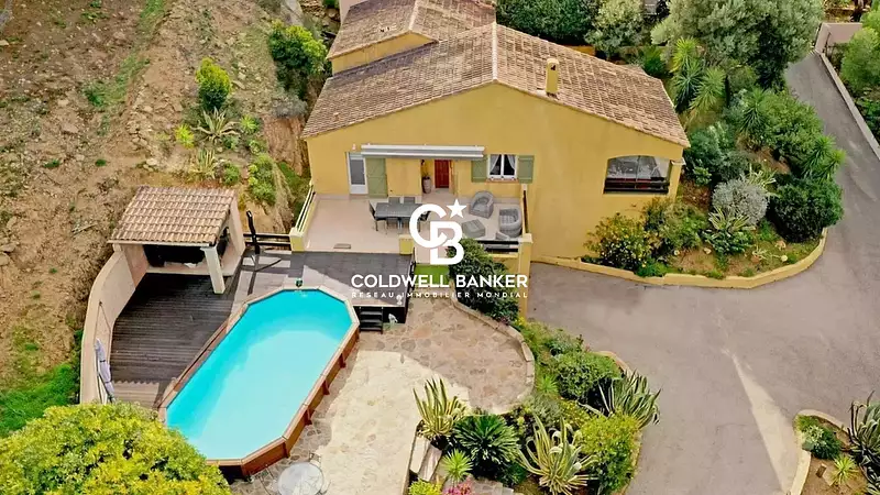 La maison se compose d'un double séjour avec cheminée, parfait pour les moments de détente, de trois chambres et d'une cuisine fonctionnelle. À l’extérieur, une piscine agrémente le jardin, propice à la détente.