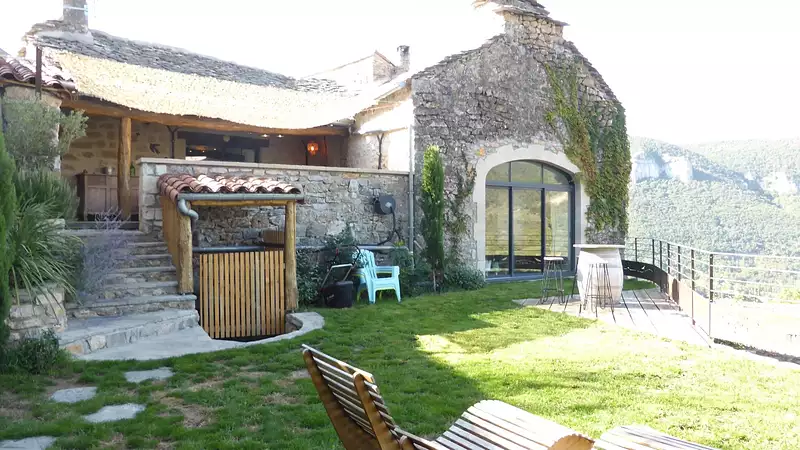 À l’extérieur, une cuisine d'été aménagée permet de profiter d’instants privilégiés face à une vue imprenable sur la vallée et les falaises. Un jardin intimiste de 100 m² vient parfaire cet ensemble harmonieux.