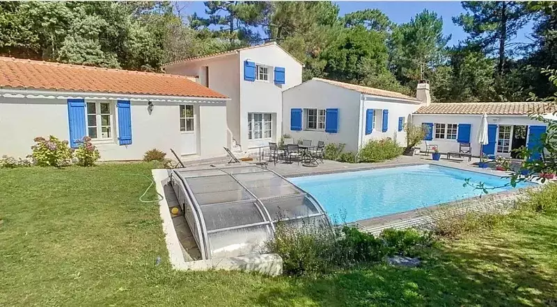 Exceptionnelle propriete au coeur du bois de la chaise charme, volumes et sérénité à deux pas de l'océan idéalement située dans un écrin de verdure, cette superbe propriété baignée de lumière offre un cadre de vie rare et privilégié. edifiée sur un terrain paysager de 1920 m², elle se compose de plusieurs espaces de vie indépendants, parfaits pour accueillir famille et amis en toute intimité. la maison principale comprend un vaste salon-séjour chaleureux avec cheminée insert, une cuisine entièrement aménagée, trois chambres, une salle d'eau, des wc séparés et un cellier. un logement annexe, avec salon-séjour et cuisine américaine, dispose de deux chambres, salle d'eau, wc, chaufferie/cellier. À l'étage (accès par escalier extérieur), deux chambres supplémentaires et une salle d'eau avec wc viennent compléter l'ensemble. vous profiterez également d'une piscine chauffée, cabanon de jardin et d'un environnement paisible, en zone blanche du pprl. un bien rare dans un secteur recherché, entre nature préservée et proximité du littoral.'les informations sur les risques auxquels ce bien exposé sont disponibles sur le site géorisques : www.georisques.gouv.fr -