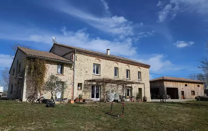 Pamiers proche, propriété d'exception : ancien corps de ferme rénové en 2018 de 239 m² sur deux niveaux avec appartement attenant de 52 m² sur 6218 m² de terrain. Au rez-de-chaussée : entrée, vaste séjour de 81,4 m² avec cheminée centrale et espace TV, cuisine ouverte équipée avec arrière-cuisine.À l'étage : mezzanine, quatre chambres, dont une suite parentale avec douche, lavabo et dressing, une salle de bains avec baignoire et vasque, et deux chambres avec placards. Garage avec chaudière à granulés assurant le chauffage au sol et l'eau chaude. À l'étage du garage, appartement de 52 m² avec cuisine ouverte sur séjour, arrière-cuisine, salle de bains, WC et deux chambres. Dépendances : hangar fermé en structure bois de 105 m², bergerie/poulailler d'environ 30 m². Terrain arboré avec potager, fruitiers, terrasse sud avec pergola, parking et puits. Assainissement individuel. En excellent état, position dominante offrant une vue imprenable sur les montagnes, murs en pierres apparentes.